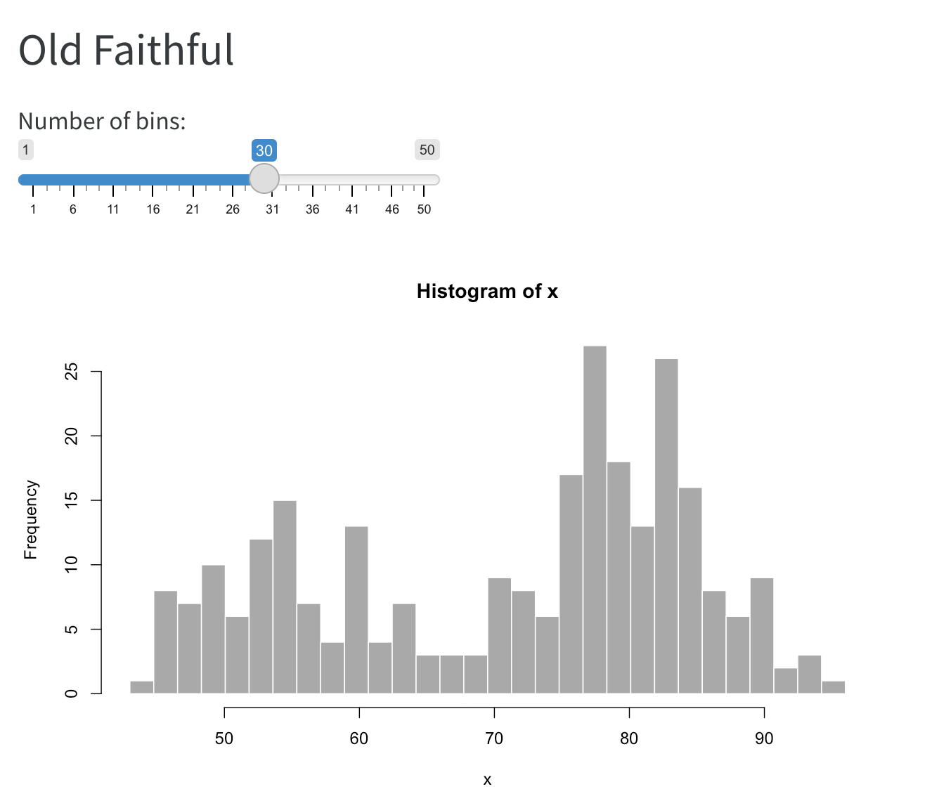 For example, here’s a document that contains a plot of the “Old Faithful” dataset along with a slider to control the number of bins: