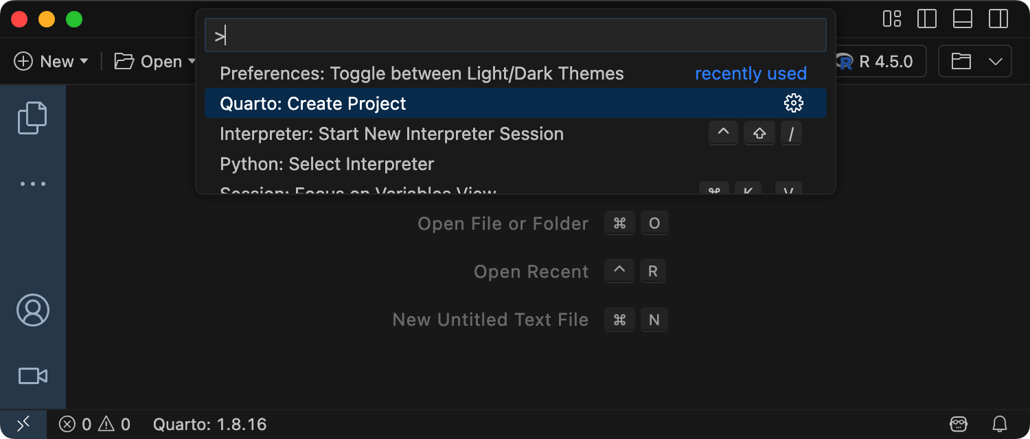 To create a new website project within Positron, execute the Quarto: Create Project command from the command-palette: